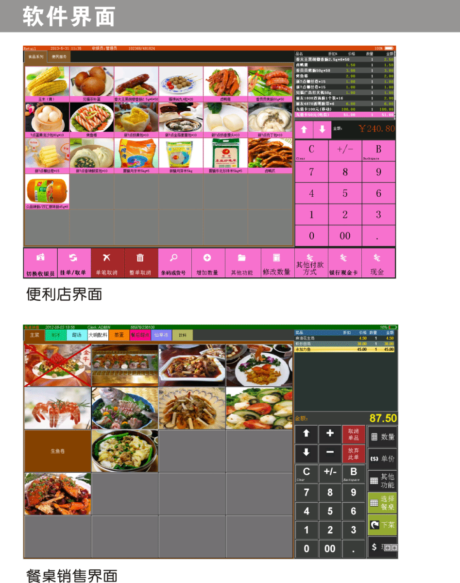 •收银软件:Windows CE6.0机型自带前台收银软件